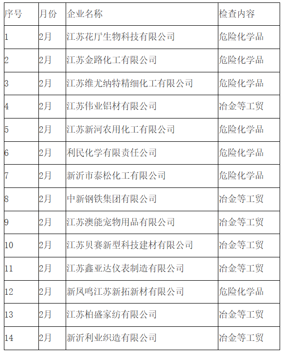 2026年2月份新沂市应急管理系统重点检查的14家企业。